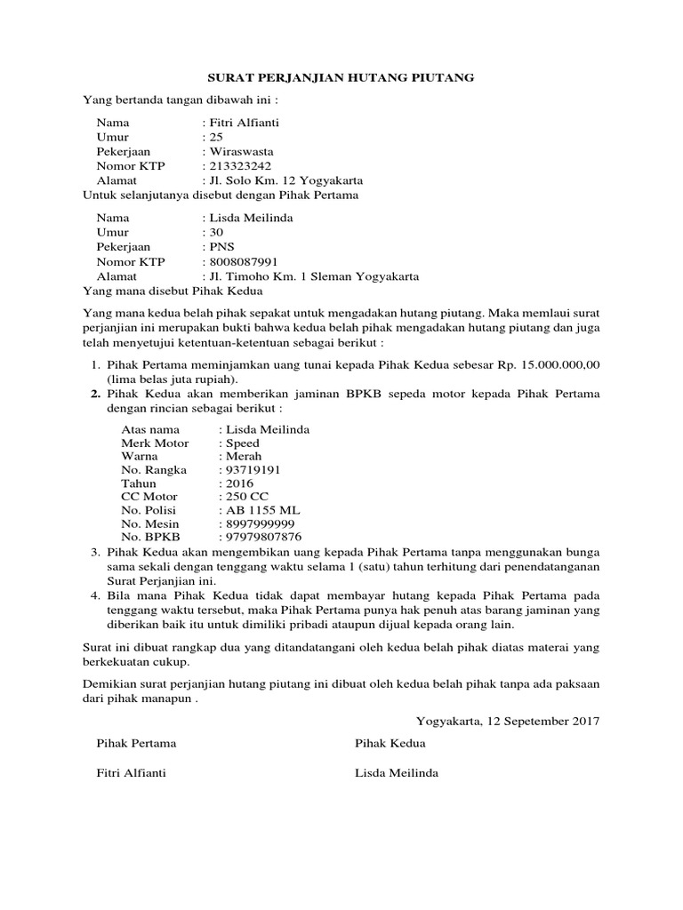 Contoh Surat Perjanjian Hutang Dengan Jaminan Sepeda Motor have a graphic associated with the otherContoh Surat Perjanjian Hutang Dengan Jaminan Sepeda Motor It also will feature a picture of a sort that may be observed in the gallery of Contoh Surat Perjanjian Hutang. Contoh Surat Perjanjian Hutang Dengan Jaminan Mobil Termasuk di dalamnya mengenai jaminan yang dberikan oleh orang yang berhutang kepada si pemberi hutang. 10 000 000 maka anda cukup memberikan jaminan berupa bpkb motor anda dimana nilai dari motor tersebut sama atau.