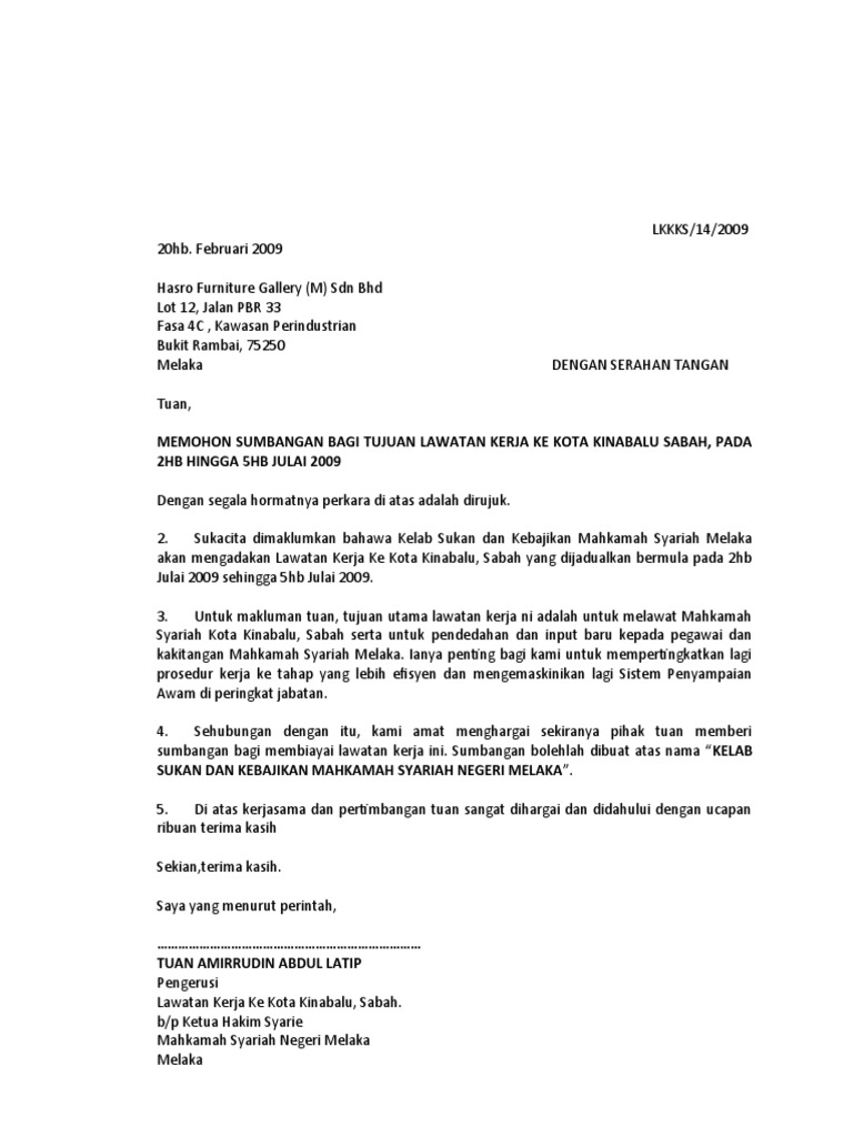 Contoh Surat Rasmi Untuk Pemeberian Sumbangan